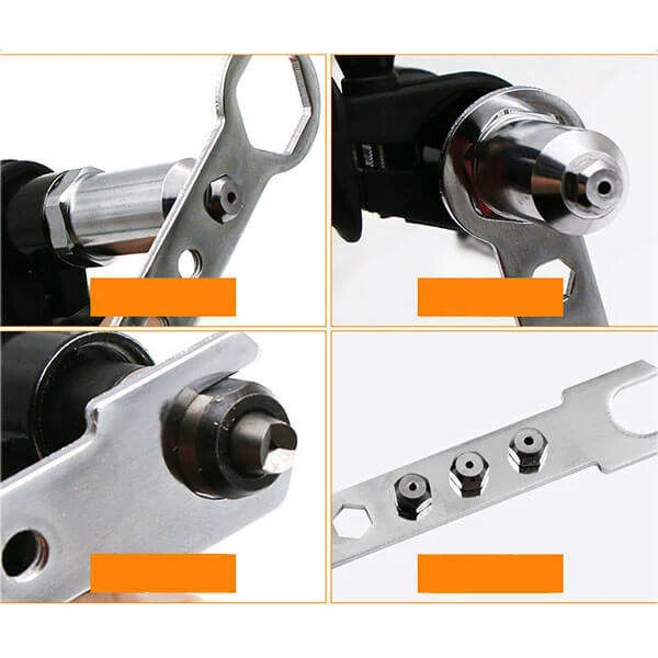 Product description: Rivelo is a rivet adapter. It is installed on an electric drill. It is light and easy to use. It comes with a vertical handle, a rivet head, 4 bits for different sizes of rivets, three bits for a rivet head and a hex key. Simply place the vertical handle on the rivet head and fasten. Then choose the appropriate extension, put it on the rivet head. Attach the adapter to the drill and start riveting. To eject the rest of the rivet, turn the reverse rotation on the drill. Failure to remove the remaining rivet can cause the adapter to jam.